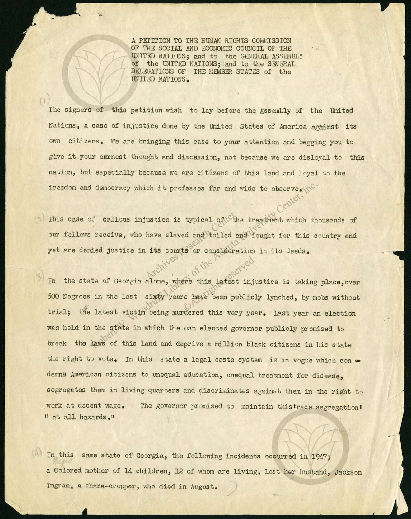 A Petition to the Human Rights Commission of the Social and Economic Council of the United Nations; and to the General Assembly Delegations of the Member States of the United Nations